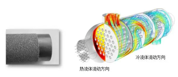 采用高通量管的換熱器能夠大大降低設(shè)計換熱面積,減小設(shè)備體積,節(jié)約工程建設(shè)投資。高通量換熱管特點是將粉末復(fù)合在換熱管基體上,改變沸騰表面的表面狀態(tài),顆粒間構(gòu)成孔隙,成為泡核沸騰中心,使膜狀沸騰改變?yōu)榕莺朔序v,顯著提高沸騰給熱系數(shù)。