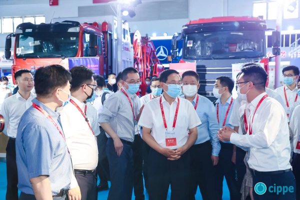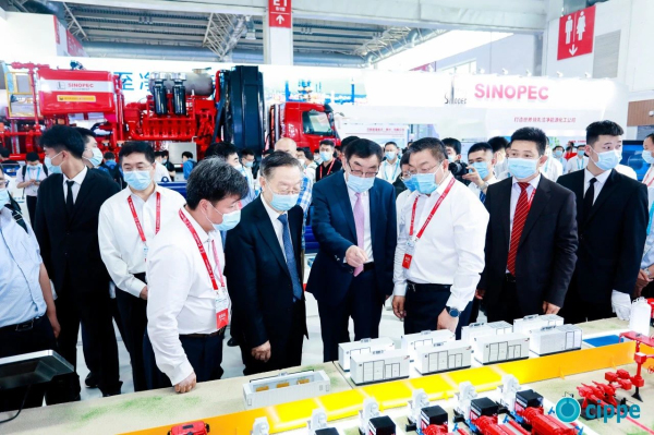 第十二屆全國政協(xié)副主席馬培華(中),工業(yè)和信息化部原部長、中國工業(yè)經(jīng)濟聯(lián)合會會長李 毅中(左二),中國石油化工集團黨組成員、副總經(jīng)理、中國石油和石油化工設(shè)備工業(yè)協(xié)會會長劉宏斌(右三)在振威展覽股份董事長 張學(xué)山(右二)陪同下參觀cippe2021