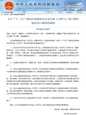 財(cái)政部、海關(guān)總、國家稅務(wù)總局近日聯(lián)合發(fā)布通知,明確“十三五”期間在我國海洋開采石油(天然氣)進(jìn)口物資免征進(jìn)口稅收。通知稱,自2016年1月1日至2020年12月31日,在中國海洋進(jìn)行石油 (天然氣)開采作業(yè)的項(xiàng)目,進(jìn)口國內(nèi)不能生產(chǎn)或性能不能滿足要求,并直接用于開采作業(yè)的設(shè)備和零件等,在規(guī)定的免稅進(jìn)口額度內(nèi),免征進(jìn)口關(guān)稅和進(jìn)口環(huán)節(jié)增值稅。