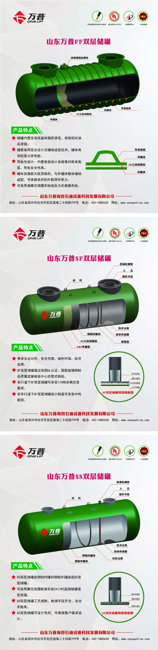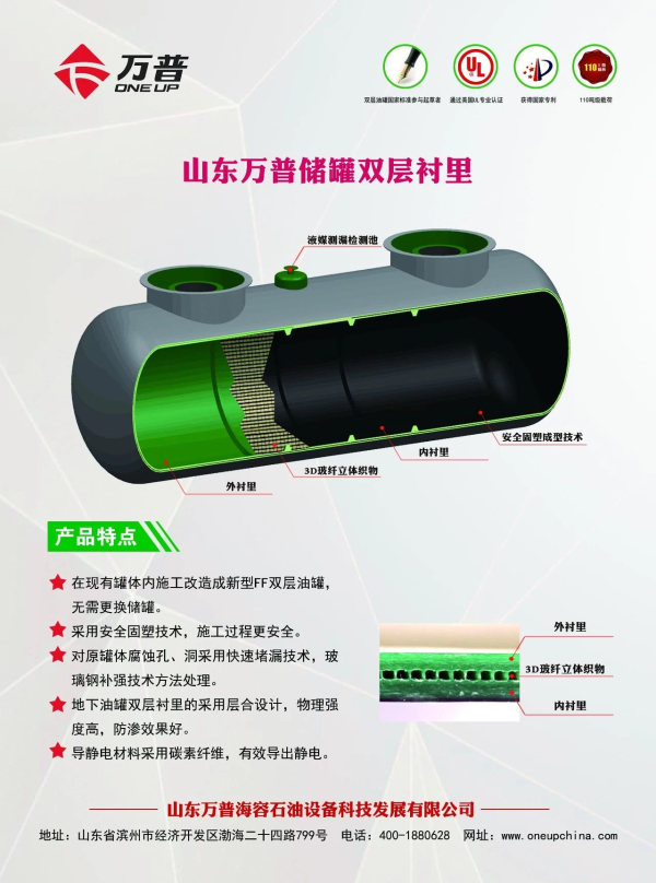 山東萬普海容石油設(shè)備科技發(fā)展有限公司(簡稱萬普公司)成立于2011年10月,是集生產(chǎn)、研發(fā)、銷售、培訓(xùn)于一體的石油化工裝備高新技術(shù)企業(yè)。萬普公司主要生產(chǎn)雙層儲罐,加油站埋地儲罐內(nèi)襯防滲改造工程,撬裝式加油裝置,D1、D2類壓力容器等產(chǎn)品,年生產(chǎn)能力6000余臺。先后通過美國UL認證、中石化安工院檢驗、國家玻璃鋼制品質(zhì)量監(jiān)督檢驗中心型式試驗。