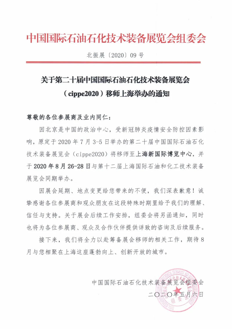 因北京是中國的政治中心,受新冠肺炎疫情安全防控因素影響,原定于2020年7月3-5日舉辦的第二十屆中國國際石油石化技術裝備展覽會(cippe2020)將移師至上海新國際博覽中心,并于2020年8月26-28日與第十二屆上海國際石油和化工技術裝備展覽會同期舉辦,歡迎您屆時參展參觀。