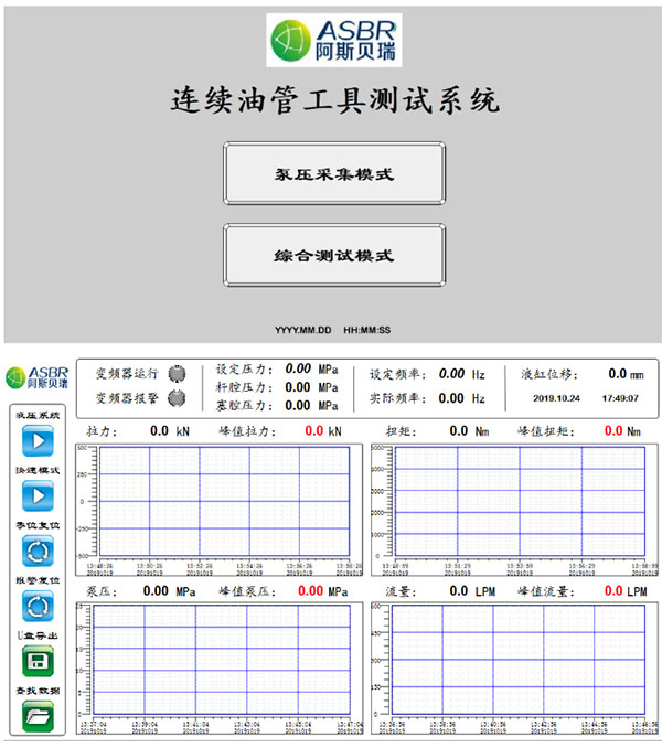 連續(xù)油管工具測(cè)試系統(tǒng),其操控方式模擬連續(xù)油管主操控制系統(tǒng),具有泵壓采集模式和綜合測(cè)試模式。根據(jù)不同的工具和不同的連續(xù)油管工藝,可輸入不同的排量和拉力,輸出泵壓、扭矩、位移、ROP、時(shí)間等參數(shù)。