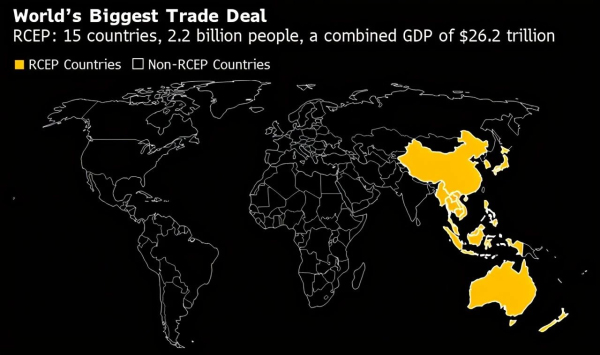 2020年11月15日,經(jīng)過多年談判的《區(qū)域全面經(jīng)濟伙伴關(guān)系協(xié)定》(RCEP)正式簽署,該協(xié)定將覆蓋世界近一半人口和近三分之一貿(mào)易量,成員包括東盟10國、中國、日本、韓國、澳大利亞和新西蘭共15方。