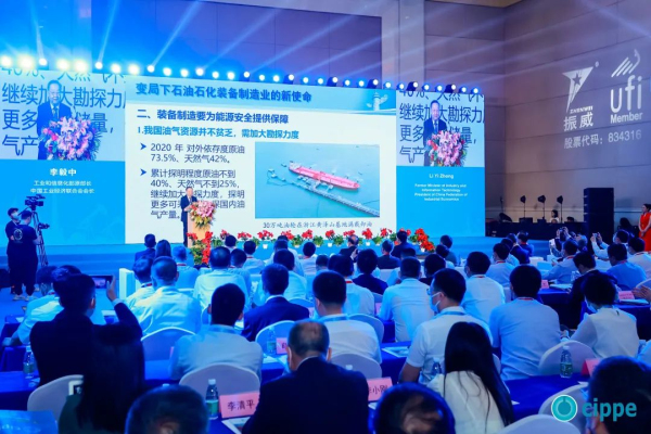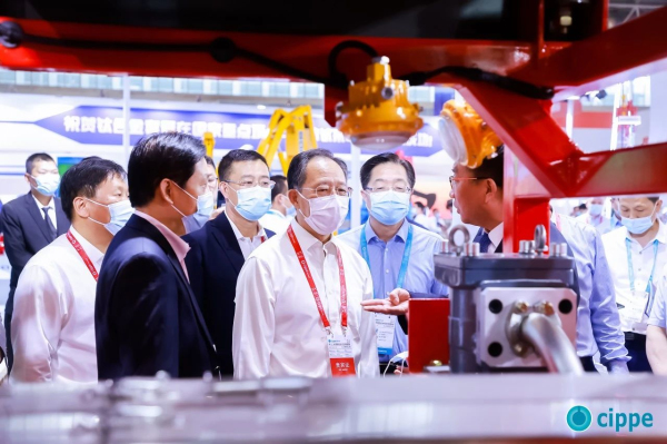 第十二屆全國政協(xié)副主席馬培華(中),工業(yè)和信息化部原部長、中國工業(yè)經(jīng)濟聯(lián)合會會長李 毅中(左二),中國石油化工集團黨組成員、副總經(jīng)理、中國石油和石油化工設(shè)備工業(yè)協(xié)會會長劉宏斌(右三)在振威展覽股份董事長 張學(xué)山(右二)陪同下參觀cippe2021